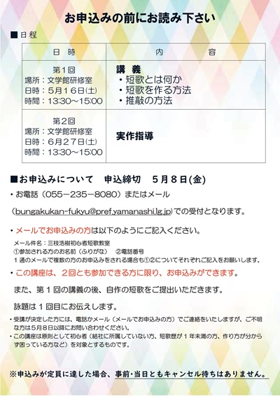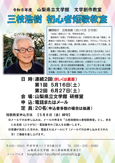 | 詳細(PDF) | 令和8年度 文学創作教室 三枝浩樹 初心者短歌教室 |