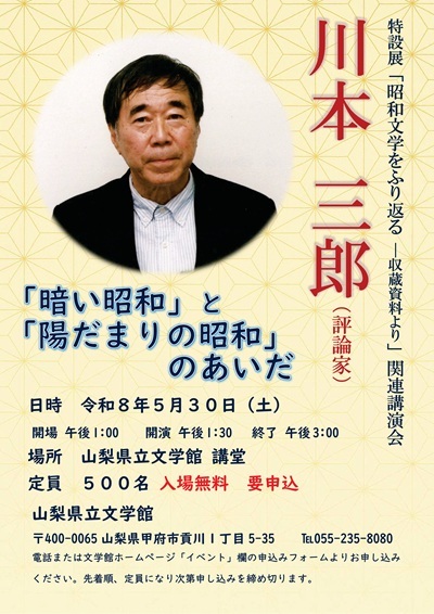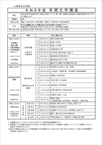 | 内容 | ![]() 【趣旨】古典文学と近現代文学、作家と作品について、第一線で活躍する研究者や当館学芸員がわかりやすく解説します。 【受講料】無料 【定員】70名 【会場】研修室 【確認事項】本講座はキャンパスネットやまなし及びことぶき勧学院連携講座です。また、諸事情により、開催を延期(または中止)する場合があります。ご来館前に当館ホームページでご確認いただくか、当館までご連絡ください。 【申込】電話でお申込ください。(年間を通してのお申込もできます。)4月21日(火)~受付開始。 【申込・問合わせ先】山梨県立文学館 甲府市貢川1-5-35 TEL 055-235-8080 ※来館される時のお願い ・受付は13時開始です。 ・展示や貸館の状況によっては駐車場が大変混雑いたします。乗り合わせでのご来館や徒歩・バス等公共交通機関でのご来館をご検討ください。 |