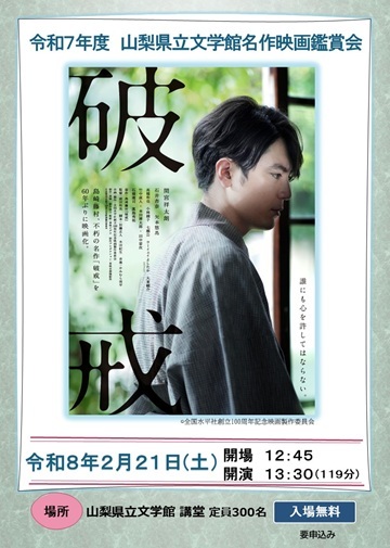 | 詳細(PDF) | 【令和7年度】名作映画鑑賞会 次回:令和8年2月21日(土)『破戒』上映時間119分 | |||||||||||||||