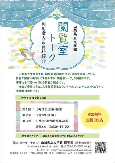 | 詳細 | ![]() 山梨県立文学館では、閲覧室の利用方法や、当館で収蔵している貴重な図書・雑誌などを紹介する「閲覧室トーク」を開催します。書庫内もご覧いただける貴重な機会です。 |