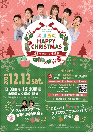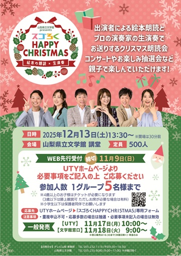 | 詳細 | ![]() スゴろく出演者による絵本朗読とプロの演奏家の生演奏でお送りするクリスマス朗読会。コンサートやお楽しみ抽選会など親子で楽しんでいただけます! 【日時】12月13日(土) 13:30開演 13:00開場 【場所】講堂 【内容】 ★UTYアナウンサーによる絵本の朗読 ★クリスマスコンサート ♪出演 ピアニスト 栗原正和 童謡歌手 雨宮知子 ★スゴろくグッズが当たるお楽しみ抽選会 ★クリスマスマーケット 【定員】500名 【チケット(全席指定・税込)】一般 2,500円 小学生以下 1,500円 ※4歳以上のお子様はチケットが必要となります (3歳以下、膝上鑑賞。ただし、お席が必要な場合はチケットが必要になります) ※小学生以下は保護者同伴でお願いします 【チケット先行予約】 11月3日(月・祝)スゴろく放送開始~11月9日(日)18:30の間に下記のUTYイベントページのお申込みフォームからお申込みください。 →ボタンは受付開始後表示されます https://www.uty.co.jp/event/info.php?no=2889 ・お申込み多数の場合は抽選となります。 ・このお申込では注文は確定せず、当落は11月12日(水)までに再度メールでお知らせ致します。 ・座席はすべて抽選にて決定させていただきます。 ・お申込受付後の変更・キャンセルはできません。 ・先行受付とはチケットの確保を目的とし、一般発売前にチケットを販売するサービスです。良席を保証するものではありませんので、予めご了承下さい。 ・フォームでお申込みの方には内容確認メールをお送り致します。迷惑メールの設定をされている方はjigyou@uty.co.jpからのメールが受信できるよう設定をお願い致します。 ・重複申込不可・必要事項未記入の場合は申し込み無効となります。 【チケット一般販売】11月17日(月) 10:00〜 ・テレビ山梨 事業部055-232-1118(平日9:30~18:00) ・山梨県立文学館 055-235-8080(9:00〜17:00)※休館日除く ※窓口販売は16:30まで(現金のみ) 【お申込み・お問い合わせ】 テレビ山梨事業部 055-232-1118(月~金 9:30~18:00) 山梨県立文学館 055-235-8080(9:00〜17:00)※休館日除く 主催:テレビ山梨/山梨県立文学館指定管理者代表企業SPSやまなし ※詳細は下記のHPまたはイベントチラシ(PDF)をご覧ください https://www.uty.co.jp/event/info.php?no=2889 |