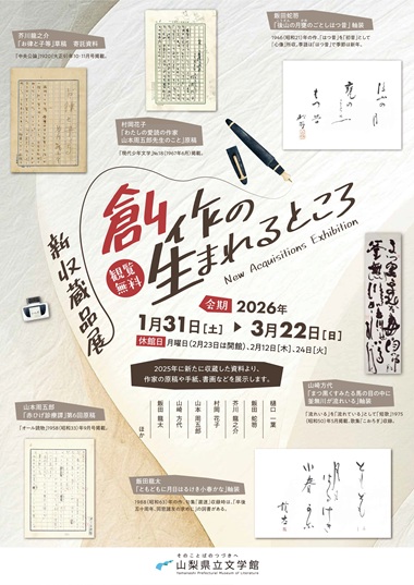 2025年に新たに収蔵した資料より、樋口一葉・飯田蛇笏・芥川龍之介・村岡花子・山本周五郎・山崎方代・飯田龍太 などの、原稿や手紙、書画などを展示します。作家の創作の現場を直筆資料から想像してみてはいかがでしょうか。